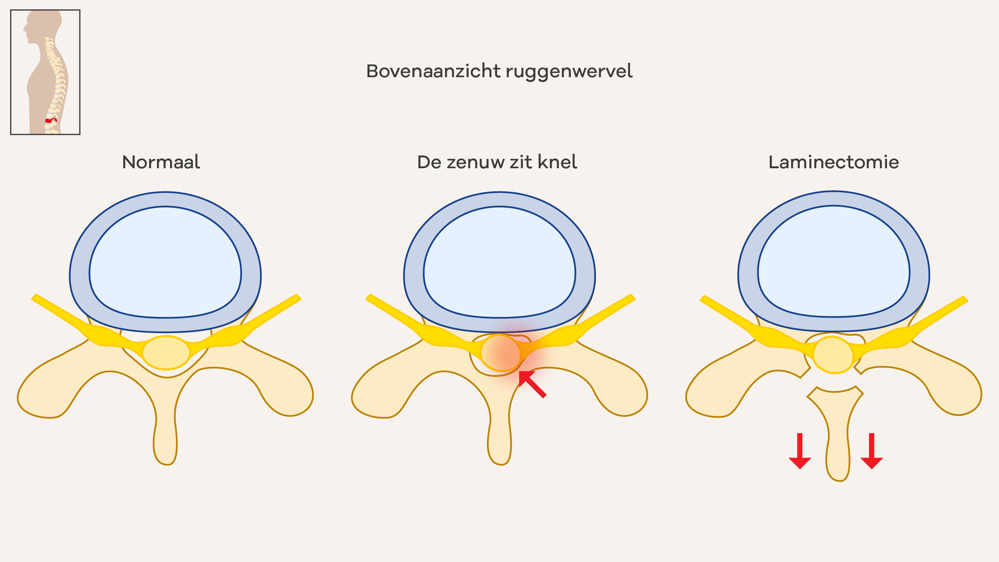 Door ouderdom of slijtage kunnen de ruggenwervels dikker worden. Hierdoor kan een zenuw klem zitten. De arts verwijdert bot en eventueel verdikt bindweefsel. De zenuw krijgt dan meer ruimte. U heeft dan minder klachten.